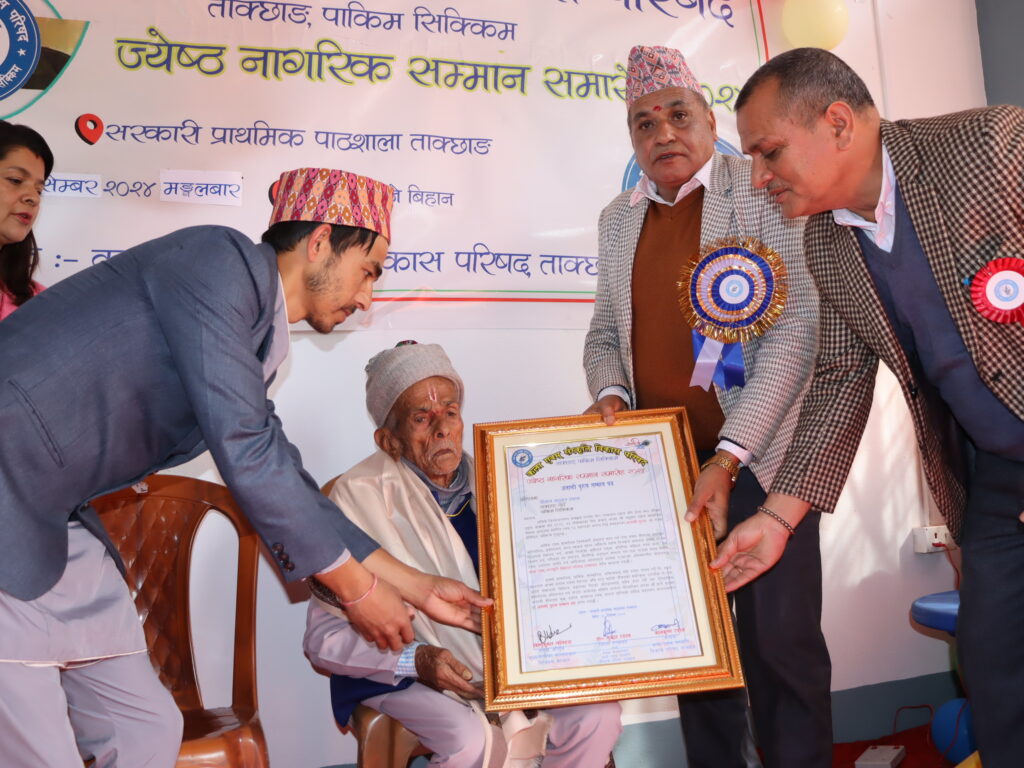 पाकिम जील्लाको ताक्छाङ गाउँमा स्थापित नवगठित संस्था कला एवम् संस्कृति विकास परिषद्को तत्वावधानमा आज ताक्छाङ प्राथमिक पाठशालाको प्रेक्षालयमा ज्येष्ठ नागरिक सम्मान कार्यक्रम सम्पन्न भयो । कार्यक्रम अवधि ताक्छाङ गाउँका निम्ति विविध कार्यहरु सम्पादन गर्ने दस जना ज्येष्ठ नागरिक एवम् शताब्दीको खुट्किला टेक्नै लागेका 96 वर्षीय लक्ष्मण दंगाललाई शताब्दी पुरुष सम्मानले सम्मानित गरियो ।