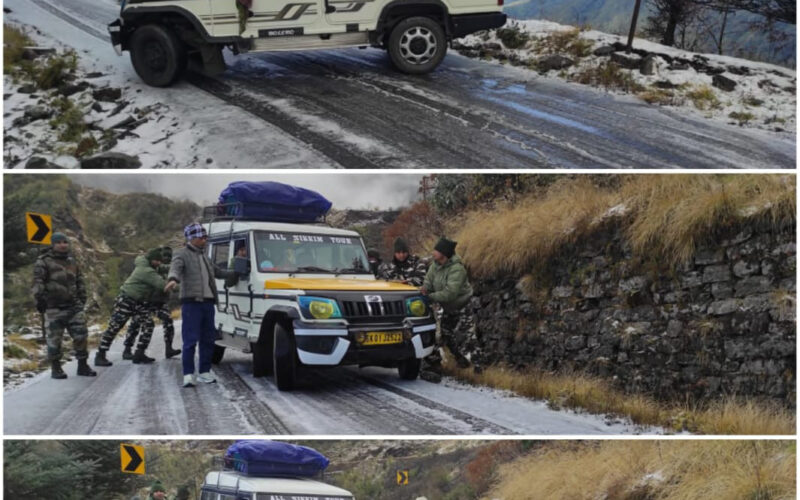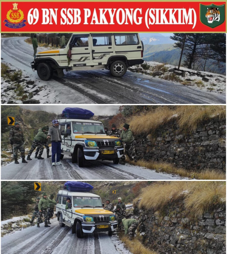 दिनांक 28.11.24 को पर्यटक वाहन क्रमांक SK-01.J-2522 जो कि वाहिनी के प्रभाव क्षेत्र में रोंगली से होते हुए धूपीधारा गाँव की तरफ जा रही थी, जिसमें कुल 10 पर्यटक (पुरुष-05, महिला-03 और बच्चे-02) उपस्थित थे । वाह्य सीमा चौकी धूपीधारा से लगभग 1.5 किलो मीटर की दूरी पर बर्फबारी होने के कारण उक्त पर्यटक वाहन फिसल कर रास्ते के किनारे खाई की तरफ लटक गया जिसके कारण ट्रैफिक लगने लग गया ।