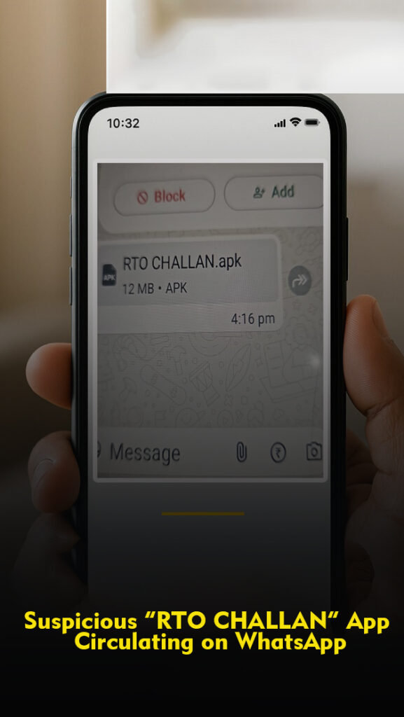 A suspicious mobile application named “RTO CHALLAN” is reportedly circulating on WhatsApp, raising alarm among users and cybersecurity experts. The .apk file, disguised as an official app related to vehicle challans, is suspected to contain malicious code or a virus that may compromise users’ personal data and device security.